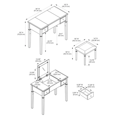 The Camden Collection has a transitional design and style. Perfect for small spaces, each item occupies minimal floor space but provides ample storage and display space. The rich Black Cherry finish exudes sophistication. The Vanity Set is a classic and timeless addition to a bedroom, large closet or dressing space. The Vanity features two side storage drawers for keeping makeup and accessories tidy. A flip top showcases a mirror and ample interior storage space. A matching stool is upholstered in a light beige fabric.