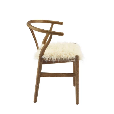Dramatic and bold, the Ellis Wishbone Chair is perfect for adding fun style to your space. The chair has a trendy wishbone styled frame that is finished in a neutral brown/gray washed finish. The faux fur seat is soft, plush and eye-catching!
