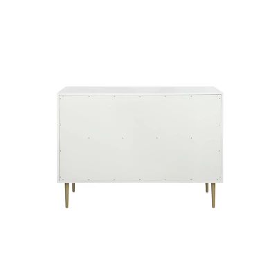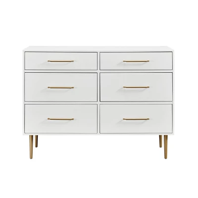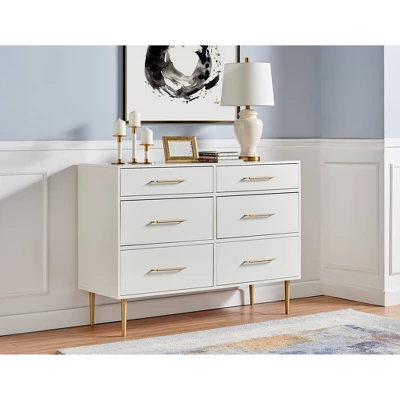 Glamorous to the eye and yet able to store a lot more than you would expect. Clean lines with slender accents of gold will finish off the design of your master bedroom or provide sophistication as a console or dining chest. With six drawers that glide open easily to store clothing, delicates, jewelry or whatever you need stored. Sleek sculpted gold drawer pulls, and legs add just the right touch.
