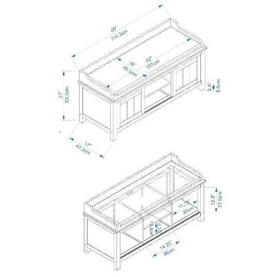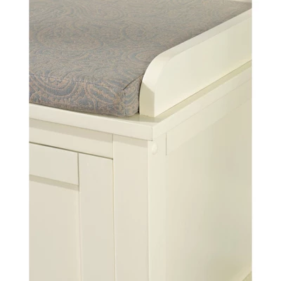 & Slate Blue Upholstered Cushion Storage Bench is perfect for adding storage and seating to an entry or hall. The bench provides ample bottom storage space for shoes, books and toys. Sliding doors keep your items hidden from sight. The white finish is an easy addition to any space. A plush cushion adds comfort to the seat.Overall Width: 45”Overall Depth: 17”Overall Height: 20.98”Seat Width: 42”Seat Depth: 16”Small Storage Width: 14.25”Small Storage Depth: 15.5”Small Storage Height: 5.25”Large Storage Width: 11.75”Large Storage Height: 12.5”Leg Height: 2”