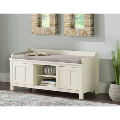- Crafted of solid wood finished in antique white, this bench is the perfect way to add seating and storage to any space in your home