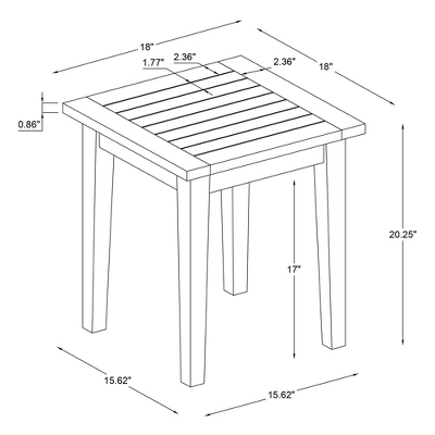 Whether it’s holding your coffee in the morning or your glass of wine as you watch the sunset, this outdoor side table is a seamless addition to nearly any setting. Constructed of solid acacia wood for its water and UV resistance, the slatted top and tapered legs are built to last through the seasons. A natural oil-based stain is applied to the surface to highlight beautiful knots and patterns of the woodgrain while also providing extra protection. This versatile piece is perfect for porches, patios, roof decks and more.Side Table:Overall Width: 18”Overall Depth: 18”Overall Height: 20”Top Thickness: 0.86”Floor to Apron Height: 17”