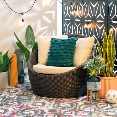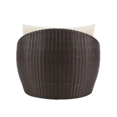 This oversized cuddle chair is perfect for curling up with a book and a cup of coffee as you enjoy the sunshine in the open outdoors. An aluminum frame is wrapped in a weather resistant shell made of resin wicker weave. The dark brown powder coated finish is paired with an off-white cushion and 2 pillows, which are water and UV resistant. Whether you’re looking to bring an enhanced boho style to your patio, rooftop or deck, this piece will surely bring your outdoor decor to a new level.