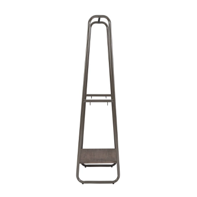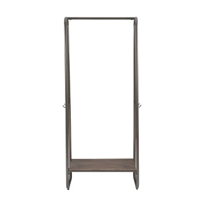 It’s time to do away with clutter and clothes draped over chairs and odd places! This minimal clothing rack provides an open canvas for your jackets, shirts, scarves and bags to hang front and center. Measuring at 25” L x 16” D x 60” H, this piece can make a big difference while taking up little floor space. The wooden bottom shelf in a distressed brown finish is perfect for storing folded laundry, shoes or bags, while 4 small hooks on both sides of the pewter metal frame offer extra hanging solutions. Easy assembly and confident style guaranteed.Overall Width: 25”Overall Depth: 15.75”Overall Height: 60”Shelf Width: 23”Shelf Depth: 15”Leg Height: 5.875”Shelf to Hook Height: 30.25”Top Width: 7.5”