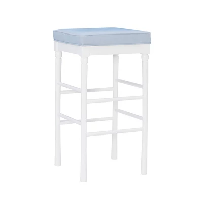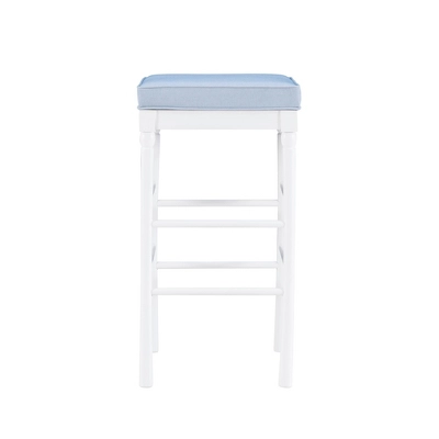 This versatile, space saving backless barstool adds comfortable seating to any kitchen counter. The farmhouse inspired design blends easily with existing decor. It features a padded seat and two footrest bars for extra support. Made from solid beechwood, the sturdy frame is finished in a crisp white. The seat is covered in a light blue, textured faux leather that is easy to clean. The stool is perfect for counters with heights 41″ and above. Commercial Grade